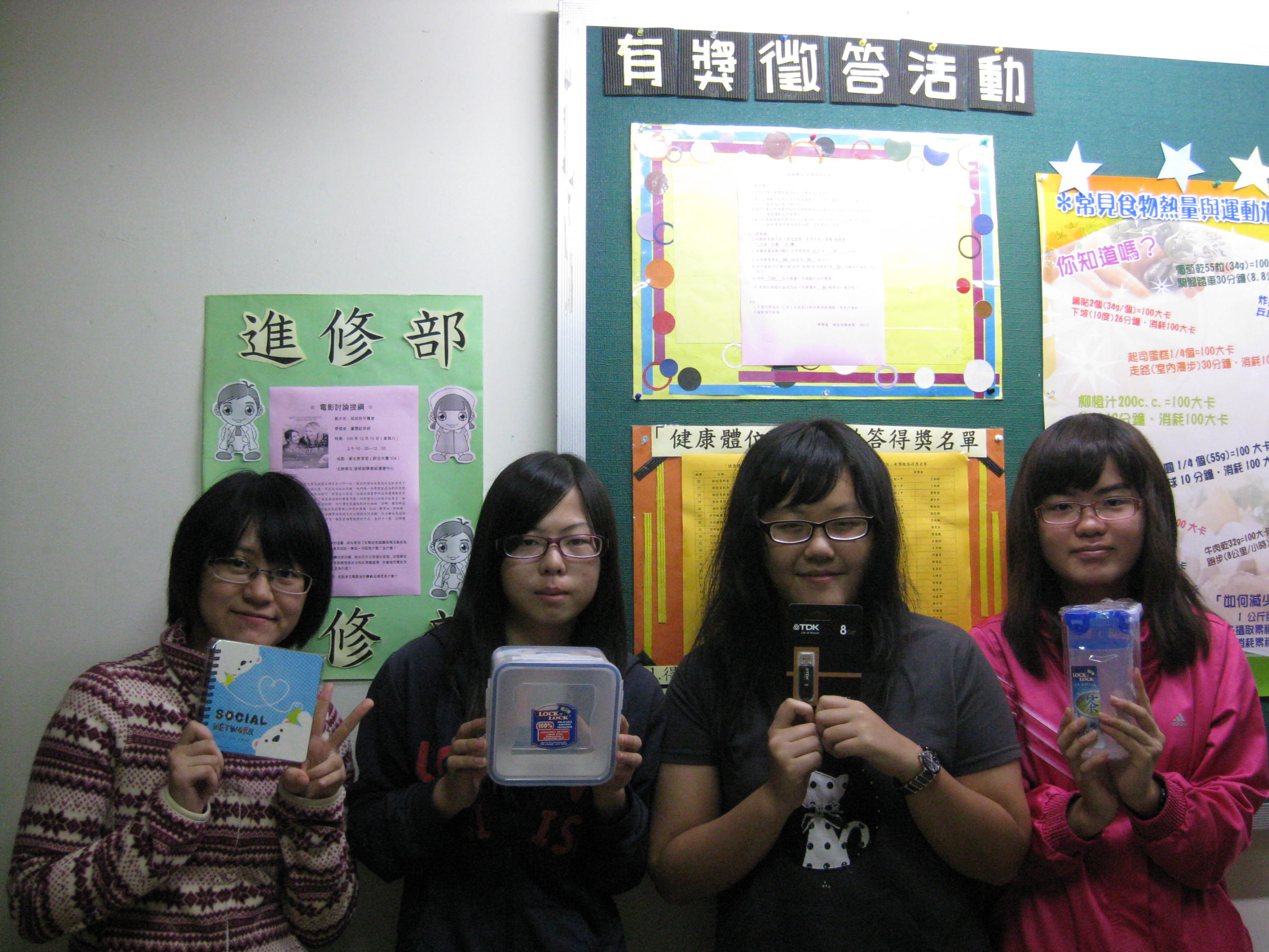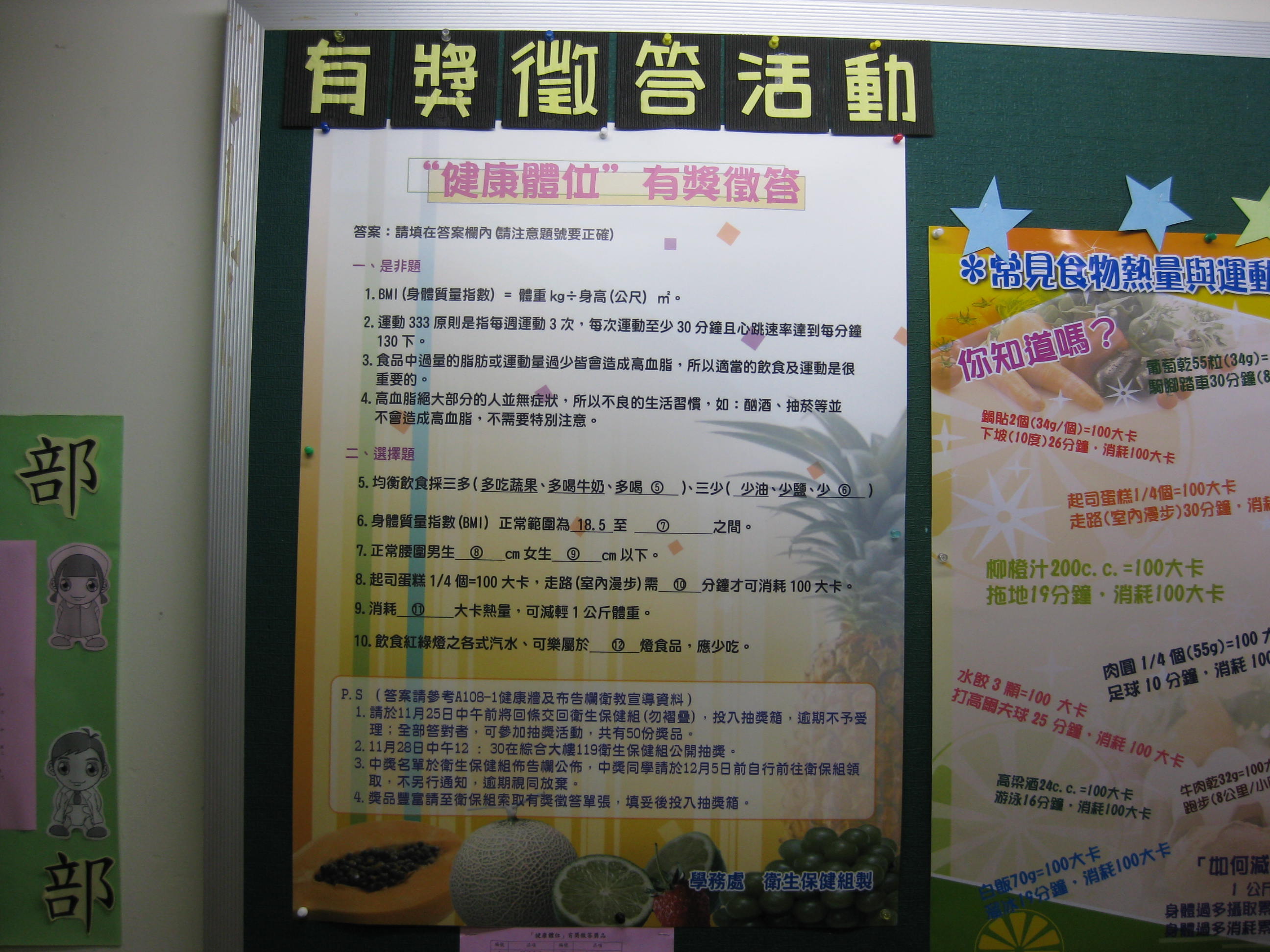 11/15-11/30辦理「健康體位」有獎徵答活動,總計398人參加,共50人獲獎。透過活動讓學生建立良好的飲食守則及運動習慣之養成,期望學生建立健康體位之正確觀念。