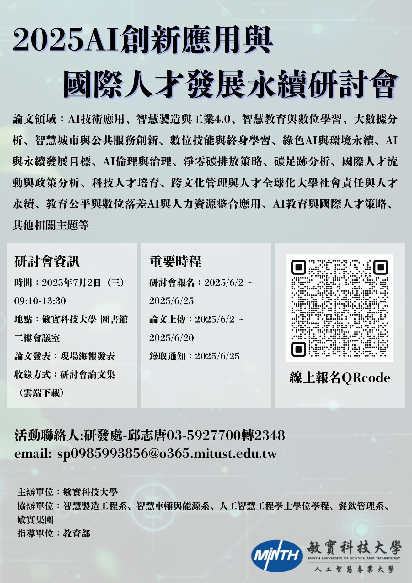 轉知-敏實科技大學辦理「2025 AI創新應用與國際人才發展永續」徵稿