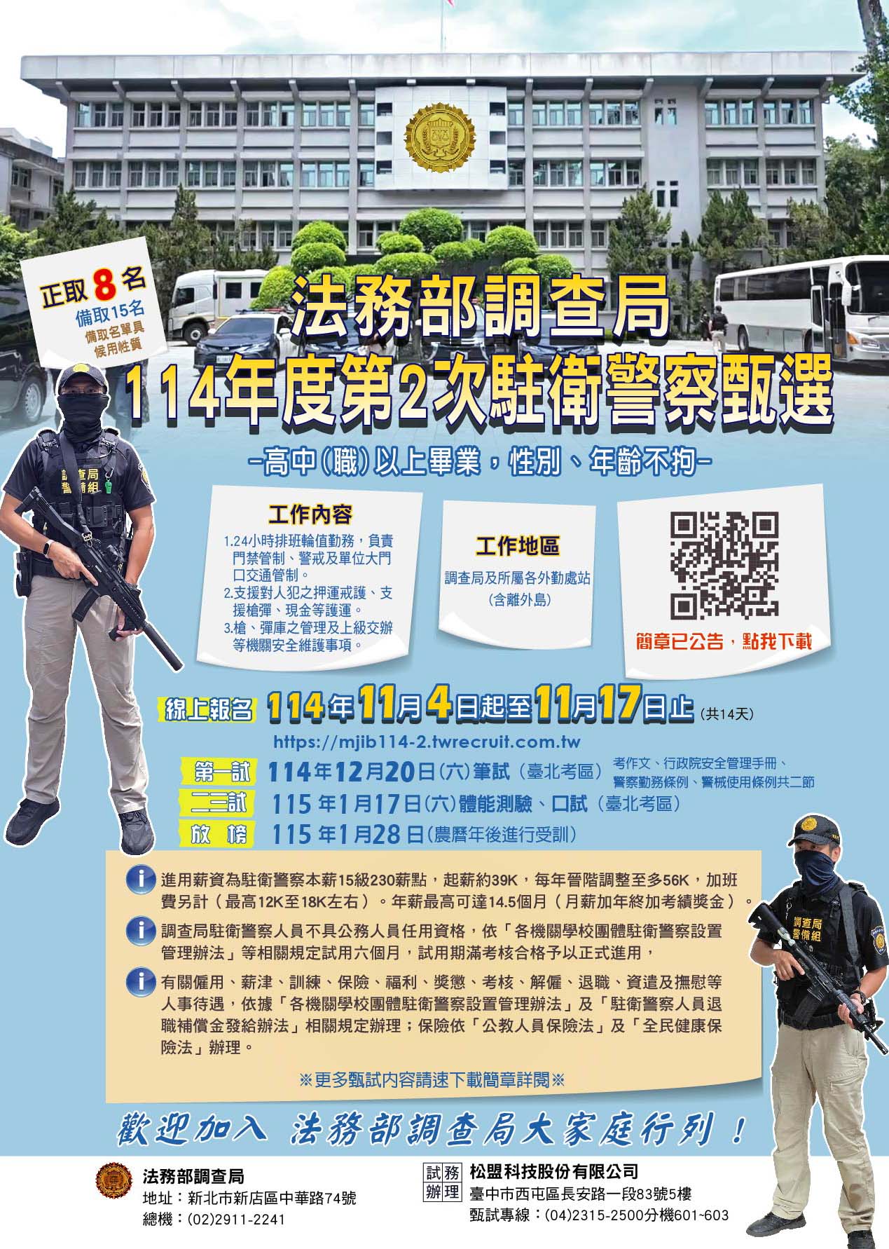 為充實駐衛警察人力,法務部調查局將辦理 「114年度第2次駐衛警察甄選考試」,請惠予協助公告周知,請查照。
