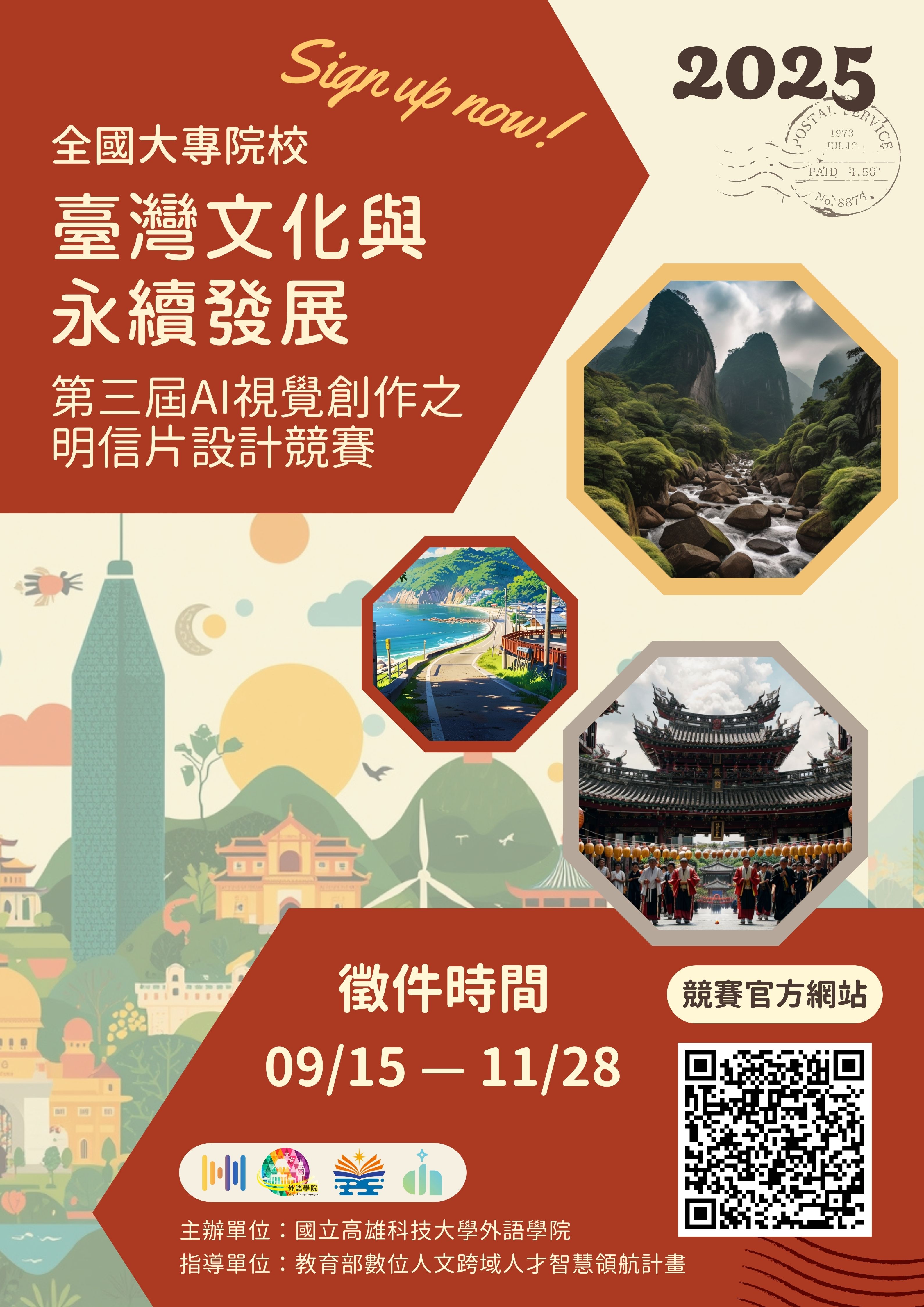 說明: 一、今年2025「臺灣文化與永續發展:第三屆AI視覺創作之明信片設計競賽」為本院「數位人文計畫」舉辦競賽活動,鼓勵參賽者深入探索臺灣文化,並透過英文和AI繪圖技術創作明信片,展現對臺灣永續發展的觀察與期望。本競賽以線上投稿方式選拔全國具潛力的優秀團隊。 二、旨揭競賽摘述如下: 活動名稱:「臺灣文化與永續發展:第三屆AI視覺創作之明信片設計競賽」。 投稿時間:即日起至114年11月28日23:00止。 公告得獎時間:114年12月24日。 競賽官網:http://aidh2023.nkust.org/index.php/3rd_aicontest-3/。 競賽投稿連結:https://forms.gle/2yqreZWNkgcRt3SJ9。 三、敬請協助廣為宣傳本競賽活動,並鼓勵貴校師生踴躍參加,檢送競賽宣傳海報及簡章電子檔。