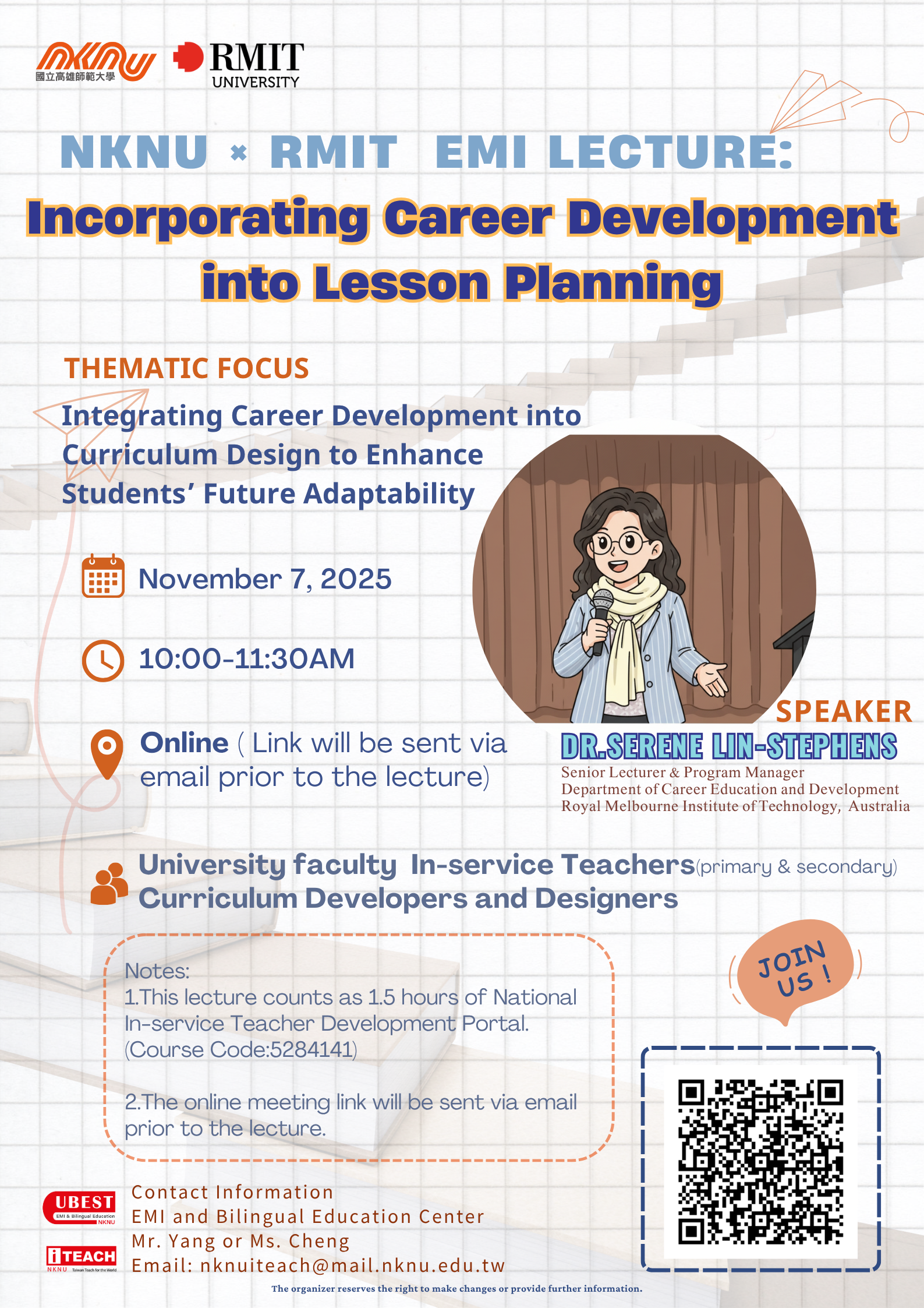 為促進大學及中等教育教師瞭解「生涯發展導入課程設計」之教學應用與未來教育趨勢,本校全英語與雙語教學推動中心特邀澳洲皇家墨爾本理工大學(RMIT University)Dr. Serene Lin-Stephens 主講,講授「Incorporating Career Development into Lesson Planning」。 講座資訊如下: 日期: 114年11月7日(星期五) 時間: 上午10時至11時30分 地點: 線上舉辦(連結將於會前寄送報名者電子郵件) 講者: Dr. Serene Lin-Stephens(Senior Lecturer & Program Manager, Department of Career Education and Development, Royal Melbourne Institute of Technology, Australia) 參加對象: 大專院校教師、在職教師、課程設計與教學發展相關人員。 本活動核列為教育部全國教師在職進修資訊網課程,研習時數1.5小時(課程代碼:5284141)。 報名方式:https://forms.gle/Sz8Arb8e92RiEuka9 檢附活動海報乙份,敬請惠予公告並轉知相關教師踴躍參加。