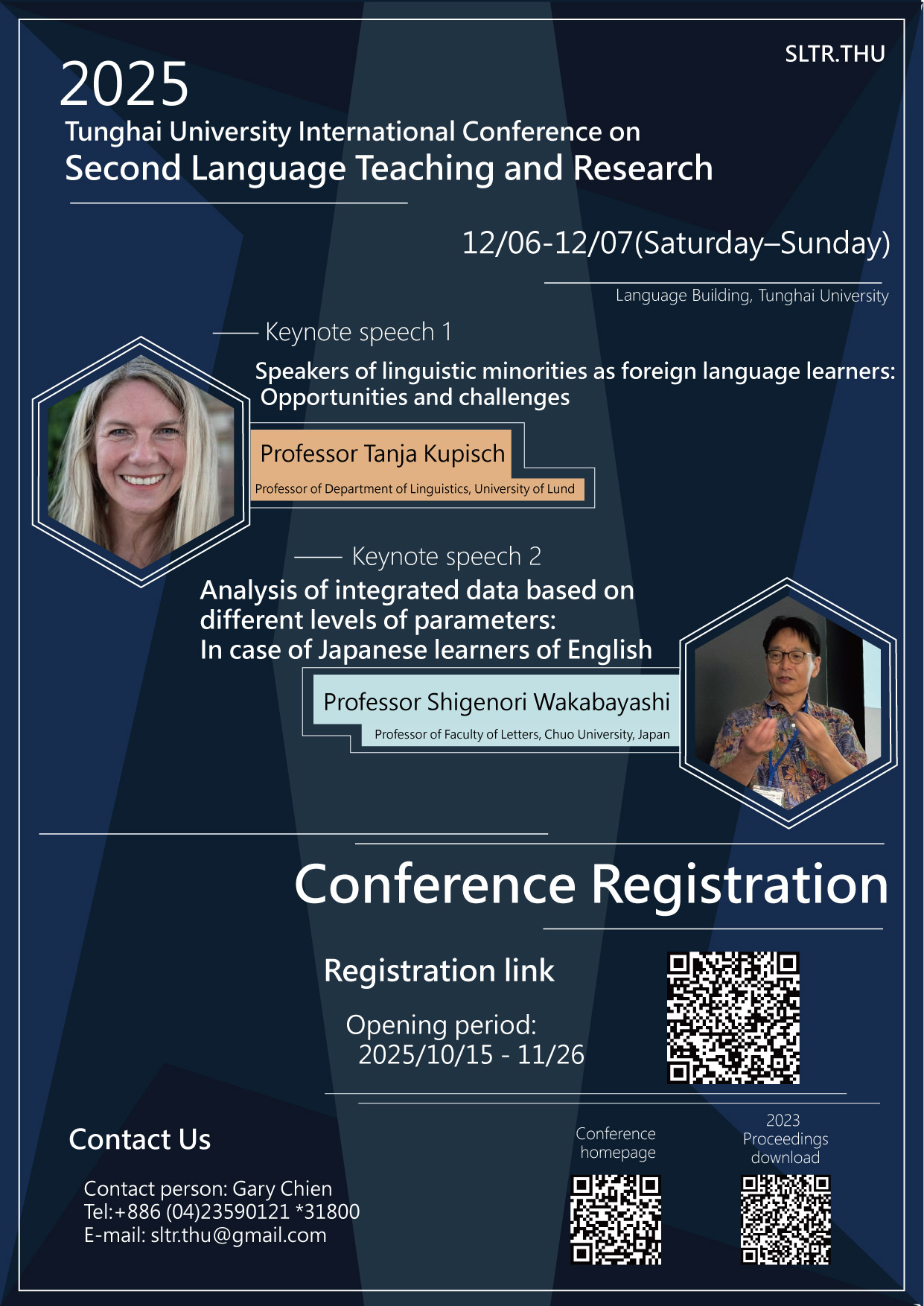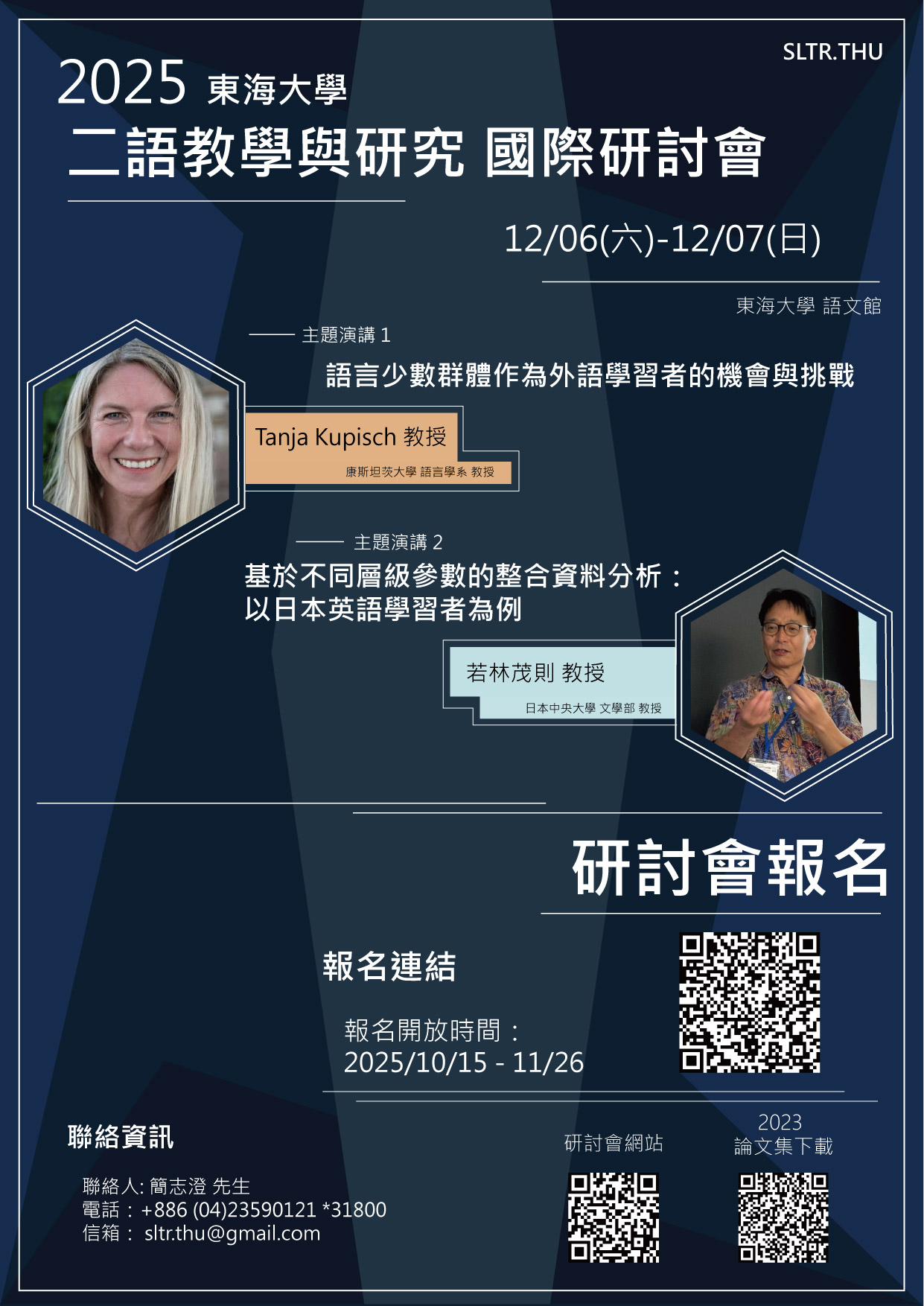 說明: 一、會議相關資訊如下: (一)旨揭研討會訂於114年12月6~7日(星期六~日)於本校舉行,會議主題為「二語教學與研究」。本研討會旨在促進不同語言領域教師與學者之間的建設性交流,並推動二語教學與研究的創新與發展。 1、專題演講資訊如下: (1)專題演講一: 甲、主題:語言少數群體作為外語學習者的機會與挑戰。 乙、講者:Tanja Kupisch 教授 康斯坦茨大學(University of Konstanz)語言學系教授。 2、專題演講二: (1)主題:基於不同層級參數的整合資料分析:以日本英語學習者為例。 (2)講者:若林茂則教授 日本中央大學(Chuo University)文學部教授。 (二)本屆徵稿已於114年8月截止,感謝各界踴躍投稿。目前正式開放與會報名,歡迎相關領域教師、研究生與實務工作者參加。 二、報名資訊如下: (一)報名期間:114年10月15日起。 (二)報名方式:請至線上表單填寫報名資訊。 (三)報名表單:https://forms.gle/fFyq6qNTxcJ1kLW5A (四)會議語言:中文、英文。 (五)會議地點:本校語文館。 三、會議網頁及相關資訊: (一)研討會官網:https://sltrthu.wixsite.com/website 四、聯絡方式: (一)聯絡人:簡志澄 先生。 (二)電話:(04)2359-0121 分機31804。 (三)電子信箱:sltr.thu@gmail.com