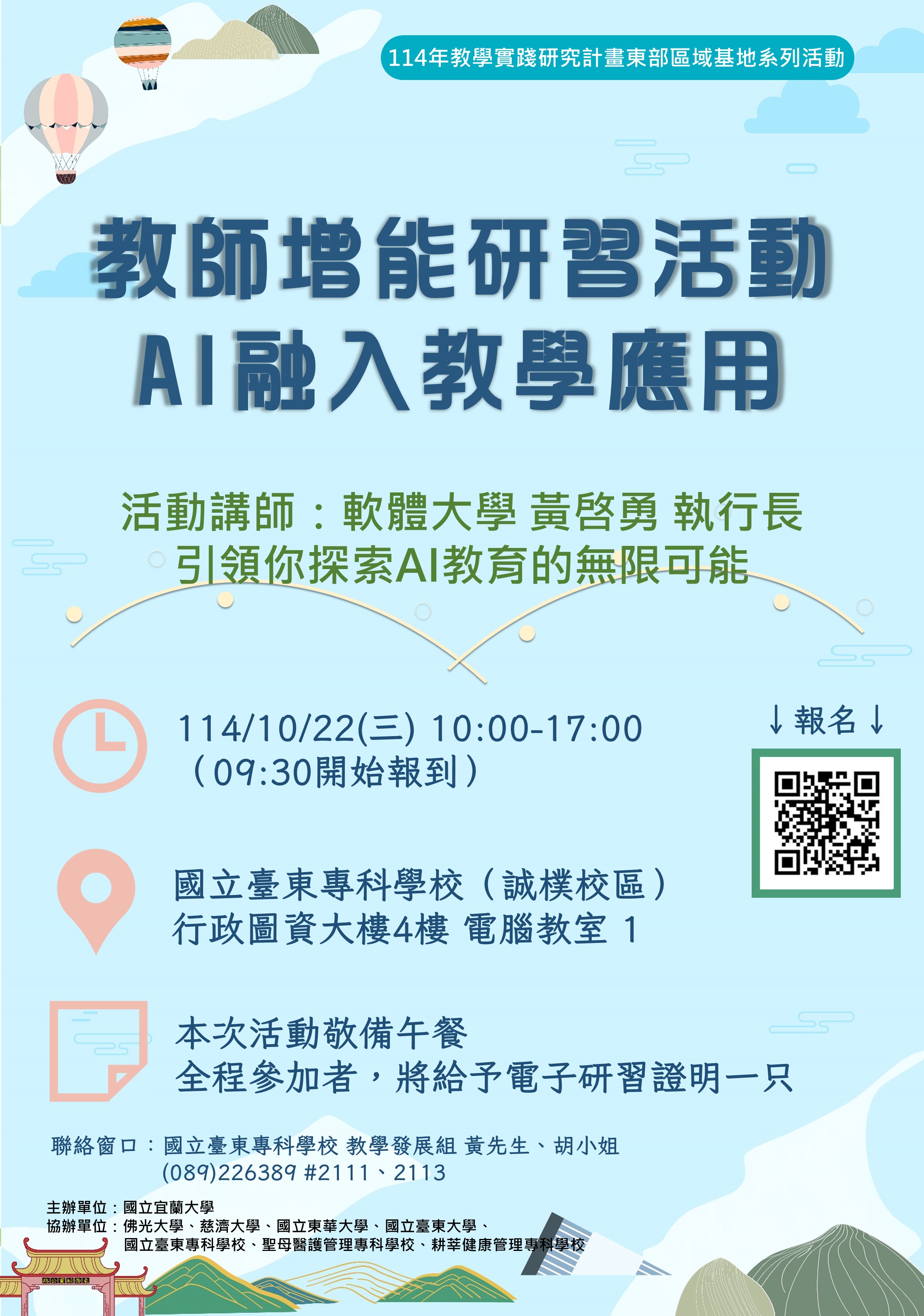 一、教學實踐研究計畫東區基地由本校與佛光大學、國立宜蘭大學、慈濟大學、國立東華大學、國立臺東大學、聖母醫護管理專科學校、耕莘健康管理專科學校共同執行推動,辦理各類活動,共構教學實踐支持網絡,提升教師研究能量及教學品質。 二、活動資訊: (1)「AI融入教學應用」研習活動 時間:114年10月22日(星期三)上午10時至下午5時。 地點:本校誠樸校區行政圖資大樓四樓電腦教室一。 講師:軟體大學黃啟勇執行長。 報名網址:https://forms.gle/FnXKG7D8w4rKPJrd9。 名額:25人(報名截止後以email寄送錄取通知)。 全程參加者,將核發電子研習證明。 (2)「USR的教學實踐路徑:從課堂到社區的永續設計」主題講座 時間:114年11月12日(星期三)下午12至2時。 地點:本校誠樸校區綜合教學大樓3樓Idea Space教室。 講師:國立臺南大學視覺藝術與設計學系系主任李香蓮副教授。 報名網址:https://forms.gle/r5tv7VZfTDaAJGm48。 名額:25人(報名截止後以email寄送錄取通知)。 全程參加者,將核發電子研習證明。 三、聯絡資訊:本校教務處教學發展組黃先生、胡小姐(電話:089-226389分機2111、2113;E-mail:weijyun@ntc.edu.tw、chi0924@ntc.edu.tw)。