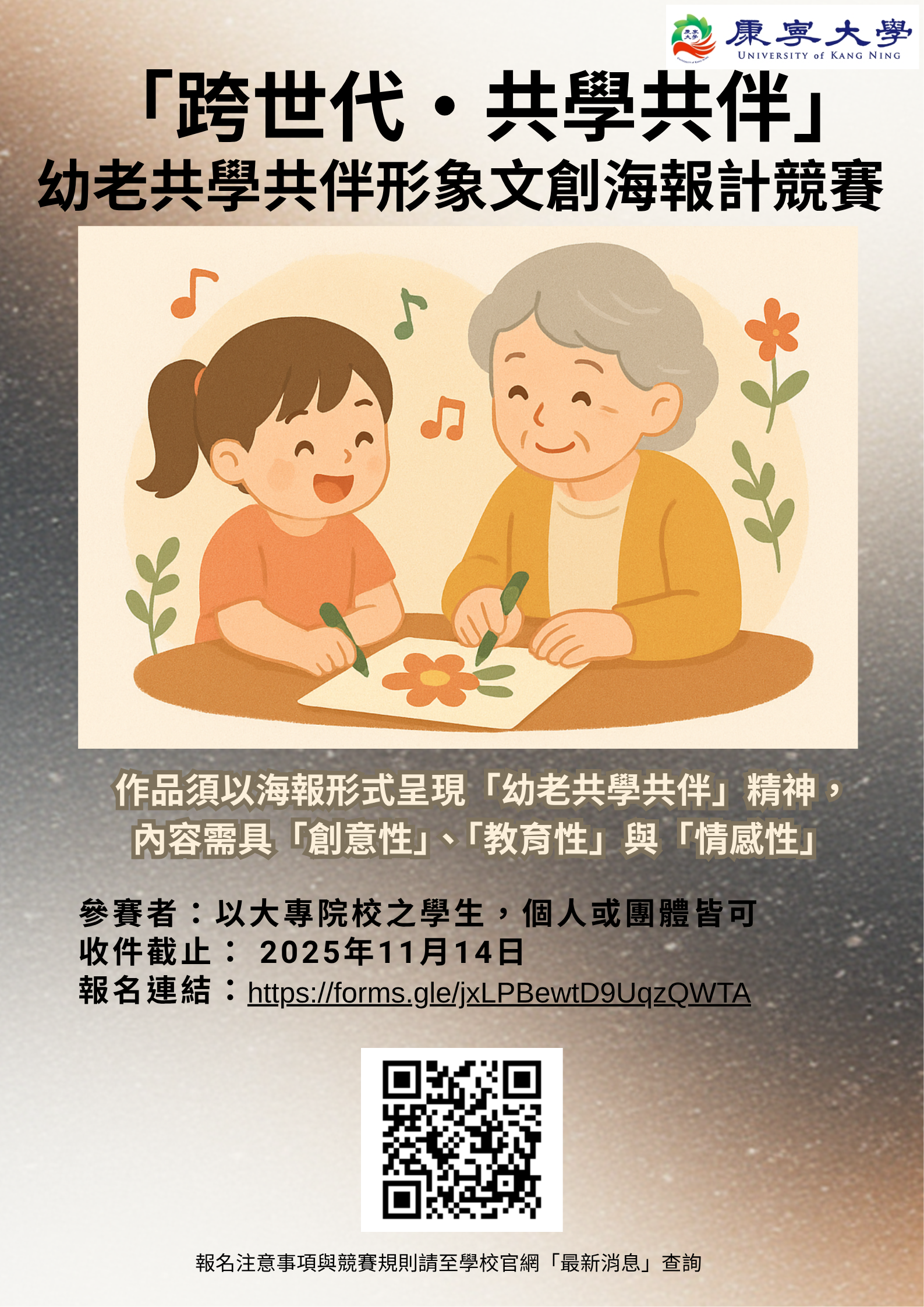 說明: 一、本競賽以「跨世代•共學共伴」為主題,鼓勵大眾以創意設計展現幼兒與長者共同學習、互相陪伴的溫馨畫面,傳達世代共融、互學互伴的社會價值。透過視覺設計,呈現幼老共學的教育意涵與情感連結,期望喚起社會對跨世代學習的重視,展現「陪伴即學習、共行即成長」的理念。競賽簡章詳如附件1,競賽宣傳海報詳如附件2。 二、競賽相關說明: (一)參加對象:全國大專院校之在學學生,以個人或團體皆可報名參加。 (二)報名截止日期:即日起至114.11.14 (三)作品初審入圍者再進入決賽評審。進入決賽稿件需於截止日(114.11.27)前掛號寄達或送達,以掛號郵件投稿者,日期以郵戳為憑。 (四)其他報名注意事項(附件3、附件4),或上學校最新消息(https://www.ukn.edu.tw/p/403-1000-12-1.php?Lang=zh-tw)下載。 三、活動聯絡人:教務處課程與教學組─彭羽琪老師(02)2632-1181分機320、682。