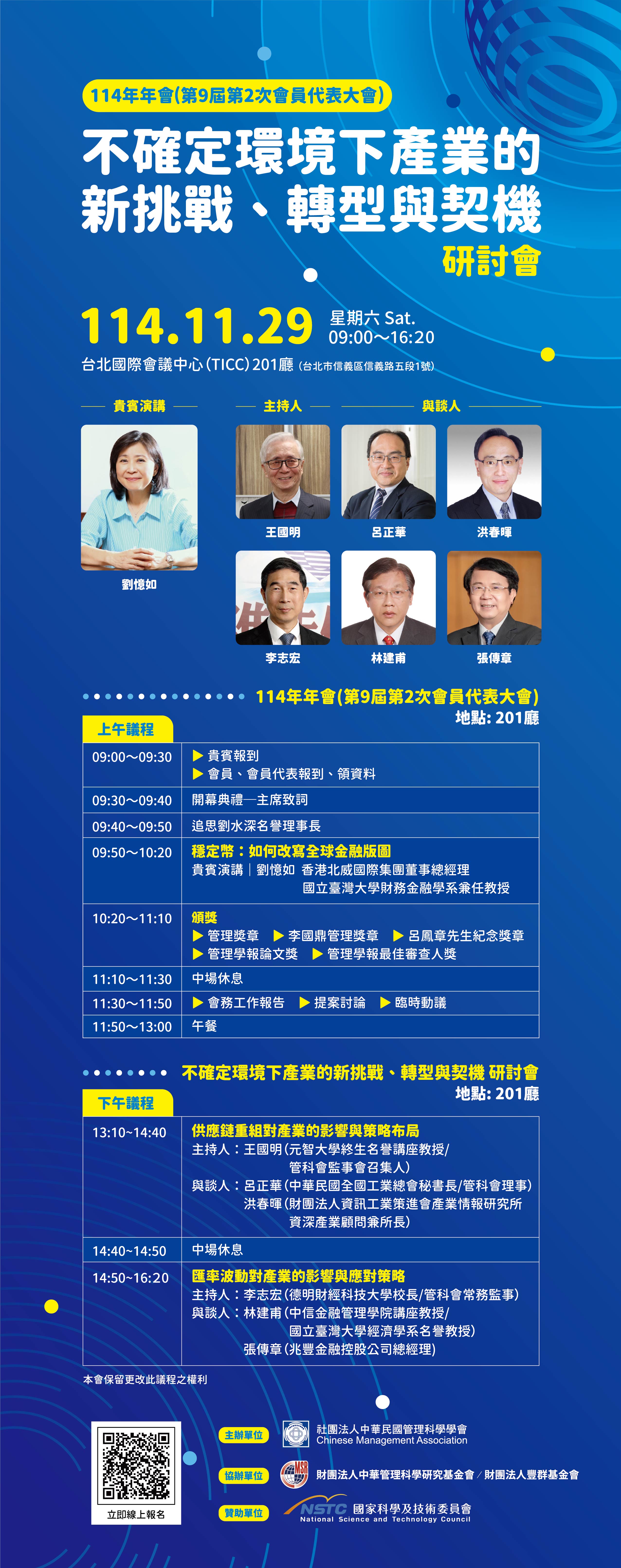 一、謹訂於114年11月29日(星期六)假台北國際會議中心(TICC) 201廳(台北市信義區信義路5段1號)舉辦旨揭活動。期透過產、政、學界專業之經驗交流,啟發推動管理教育與企業管理經營的新格局,敬邀各界先進共襄盛舉。