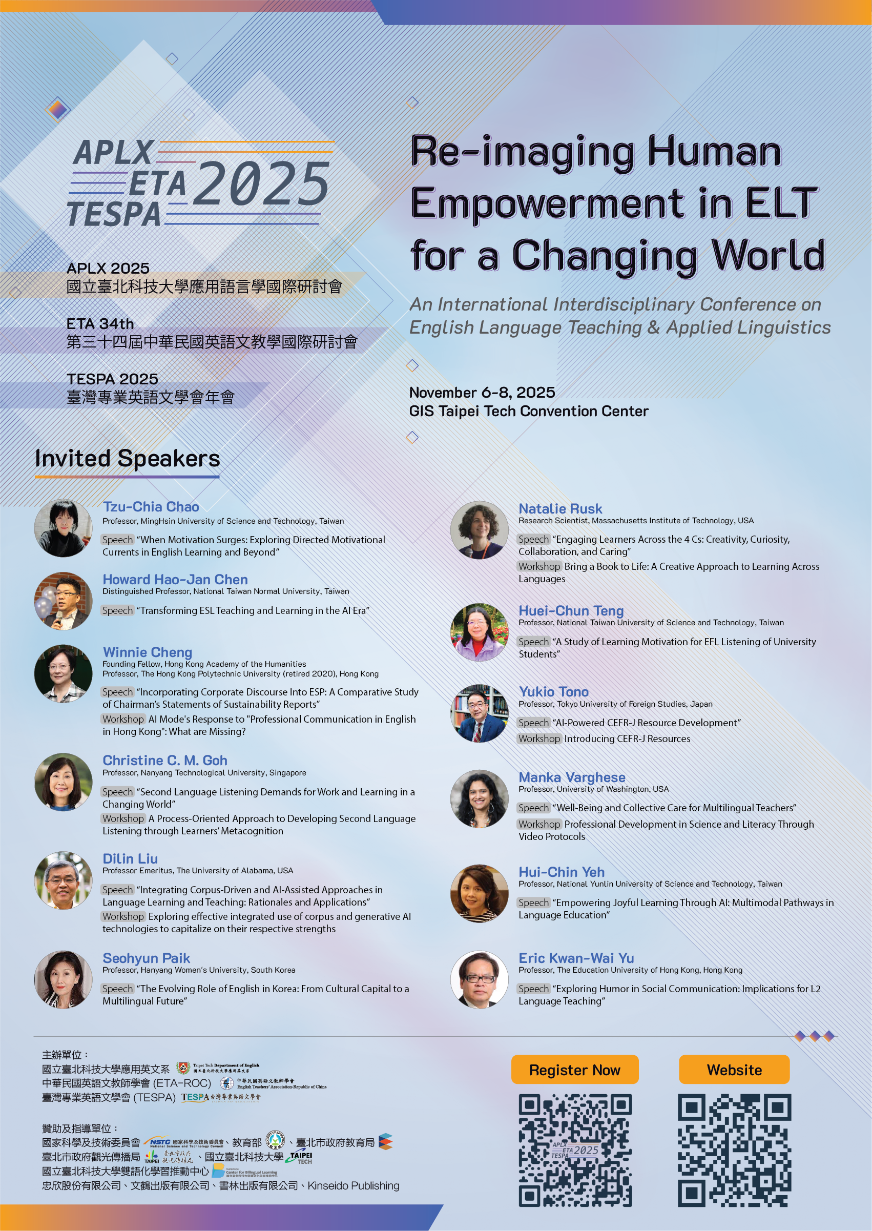 一、旨揭研討會相關訊息如下: (一)會議名稱:第三十四屆中華民國英語文教學國際研討會暨國立臺北科技大學應用語言學國際研討會暨臺灣專業英語文學會年會。 (二)報名日期:即日起報名至114年10月31日止。 (三)報名連結: 1.中文版:https://forms.gle/5MG3cbguTPcX11Fa8 2.英文版:https://forms.gle/yiGtZieYTXFLkEwaA (四)舉辦日期:114年11月6日至8日。 (五)舉辦地點:集思北科大會議中心。 (六)會議網址:https://aplx.org/2025/。 二、有關研討會議程、講者等更多詳細資訊,歡迎參閱會議網址,若有未盡事宜,請洽詢研討會專屬聯絡電子郵件信箱:aplx2025@gmail.com 。