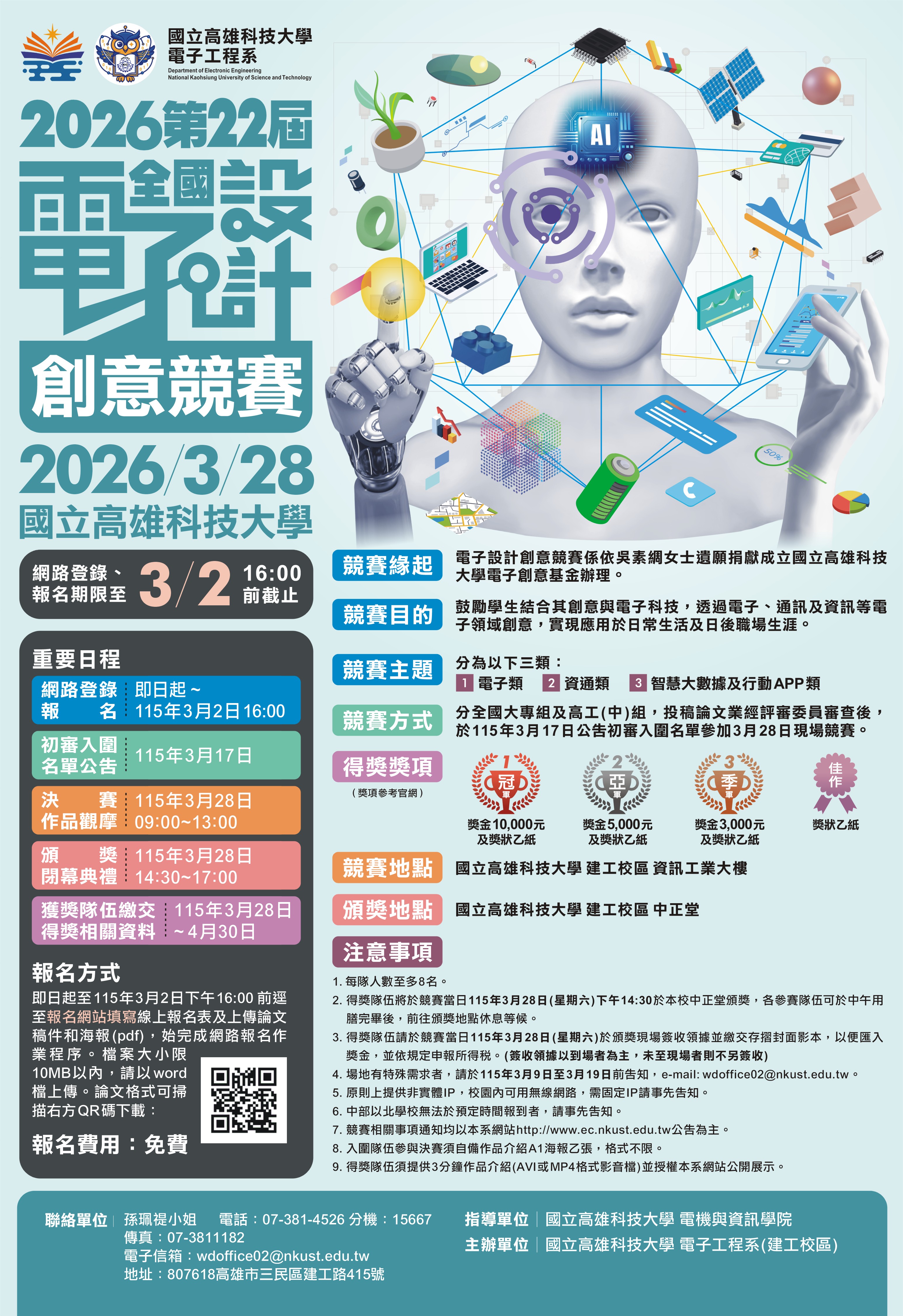 轉知-國立高雄科技大學舉辦「2026年第二十二屆全國電子設計創意競賽」