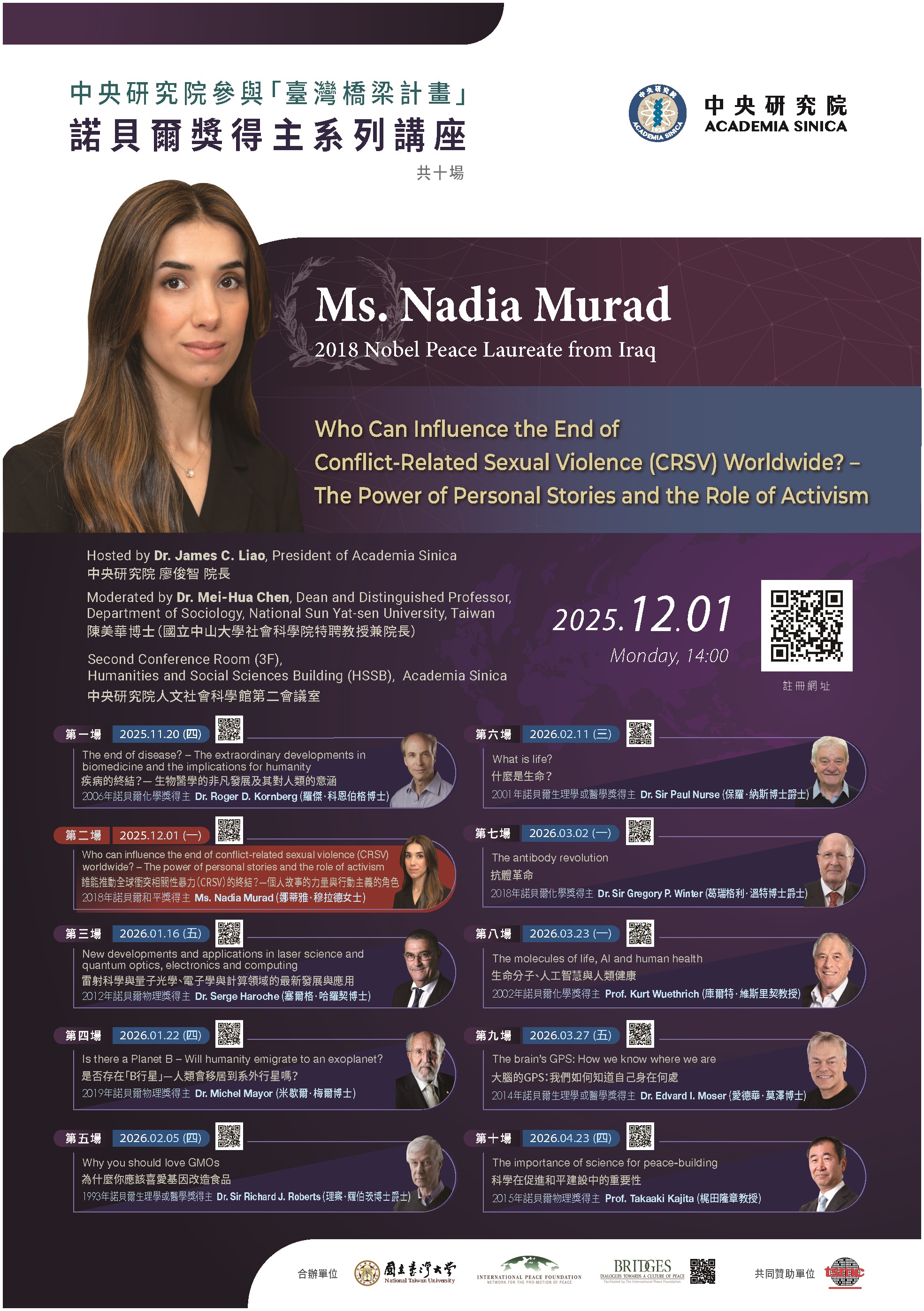 說明: 一、「臺灣橋梁計畫」自本(114)年11月起至115年4月,共將邀請 31 位諾貝爾獎得主訪問本院及全臺十餘所大學,相關資訊請參閱網站:https://www.peace-bridges.net/。 二、本院將邀請其中10位蒞院演講與交流,第二場演講資訊如下: (一)時間:本年12月1日(星期一)下午2時整 (二)地點:本院人文社會科學館三樓第二會議室 (三)講題:Who Can Influence the End of Conflict-Related Sexual Violence (CRSV) Worldwide? - The Power of Personal Stories and the Role of Activism(誰能推動全球衝突相關性暴力的終結?—個人故事的力量與行動主義的角色) (四)檢送演講海報電子檔1份,洽詢專線:本院國際事務處,(02)27899895。 (五)報名網址:https://forms.gle/E2C4dAi9ewUimNb88 。