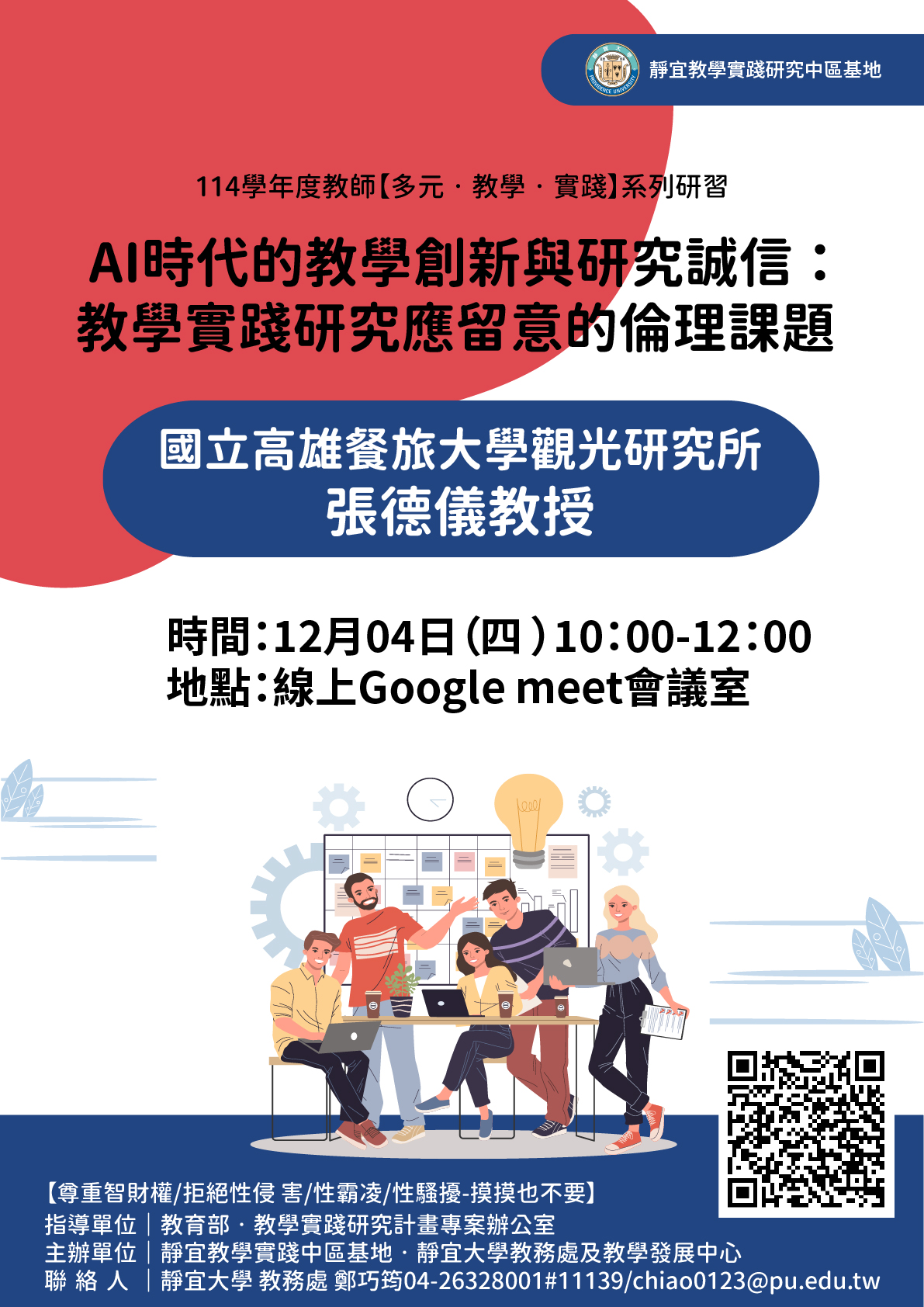 一、旨揭活動目的係為協助教育部推動教學實踐研究計畫,希冀透過區域基地學校辦理之各類活動,跨校共構教學實踐支持網絡,推動教師支持系統,落實學生為核心之教學實踐研究之任務。 二、活動資訊: (1)研習活動一 主題:「AI時代的教學創新與研究誠信:教學實踐研究應留意的倫理課題」。 講師:國立高雄餐旅大學觀光研究所 張德儀教授。 時間:114年12月4日(星期四)上午10時至12時。 地點:線上Google meet會議室。 報名網址:https://reurl.cc/eVXl2j,即日起至12月3日(星期三)中午12時止。 (2)研習活動二 主題:「跨域學習教案智造所:用AI與設計思考開啟課程新可能」。 講師:大葉大學多媒體數位內容學士學位學程 丁后儀助理教授。 時間:114年12月5日(星期五)下午1時至5時。 地點:靜宜大學宜園3樓iDO培力基地。 報名網址:https://reurl.cc/Eb77Mm,即日起至12月3日(星期三)中午12時止。 三、全程參與線上研習者,將頒予教學實踐研究中區基地電子式研習證明;全程參與實體研習者,將頒予教學實踐研究中區基地紙本研習證明。 四、隨函檢附海報、交通資訊與校區配置圖,敬請協助公告。 五、活動聯絡人:靜宜大學教務處鄭巧筠助理(電話:04-26328001分機11139,E-mail: chiao0123 @pu.edu.tw)。