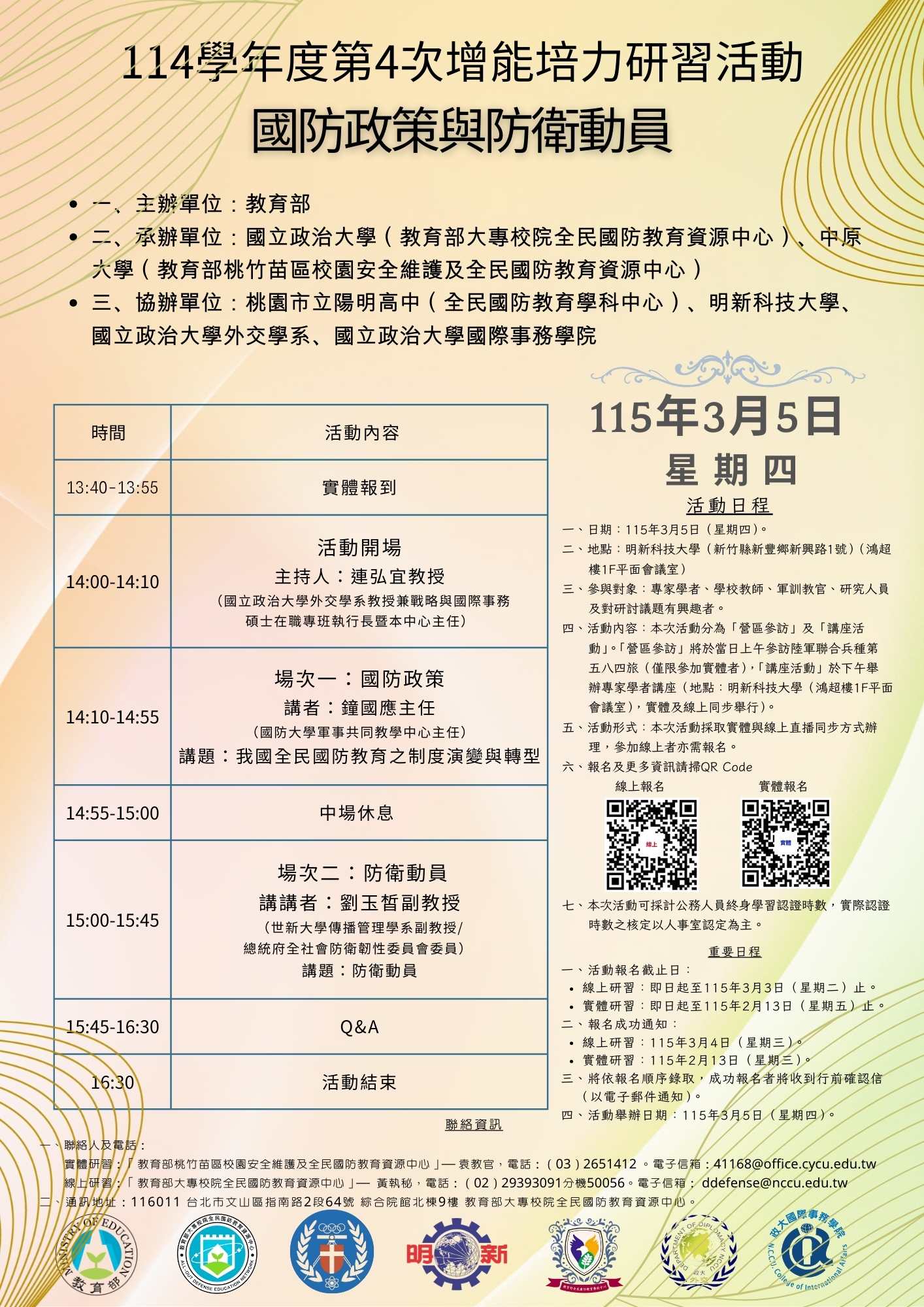 「教育部大專校院全民國防教育資源中心114學年度第4次增能培力研習活動」實施計畫及海報各1份,敬請鼓勵教師、職員、軍訓教官及對議題有興趣者踴躍參與 一、依據教育部114年7月16日臺教學(六)字第1140071237號函核定114學年度工作計畫辦理。 二、舉辦時間:115年3月5日(星期四)。 三、舉辦地點:明新科技大學(新竹縣新豐鄉新興路1號)(鴻超樓1F平面會議室)。 四、研習時間: 1.線上研習:115年3月5日(星期四)下午2時至4時30分。 2.實體研習:115年3月5日(星期四)上午8時30分(A車報到時間);上午9時30分(B車報到時 間)。 五、報名方式及期限: 1.線上研習:請至https://forms.gle/2KQDPBzAntwDCQ8F6報名。(即日起至115年3月3日(星 期二)止) 2.實體研習:請至https://itouch.cycu.edu.tw/go/?w=9279@forms報名(先前已完成報名者, 無須再重覆報名,本次限桃竹苗區大專院校報名)(即日起至115年2月13日(星期五)止) 六、聯絡資訊: 1.線上研習:「教育部大專校院全民國防教育資源中心」─ 黃執秘,電話:(02)29393091分機 50056。電子信箱:ddefense@nccu.edu.tw 2.實體研習:「教育部桃竹苗區校園安全維護及全民國防教育資源中心」─袁教官,電話:(03) 2651412 。電子信箱:41168@office.cycu.edu.tw
