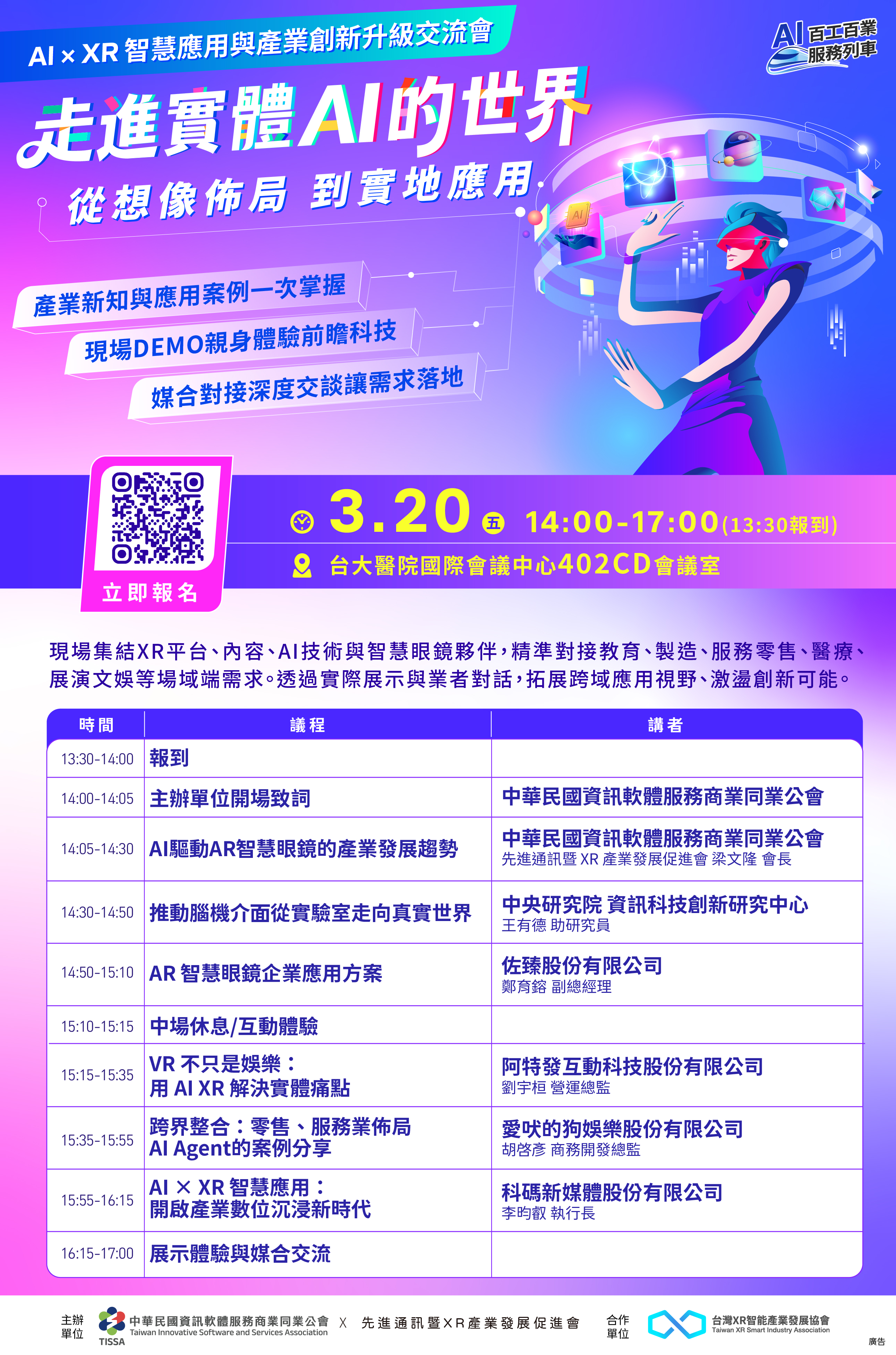 一、為推廣 AI 與 XR 技術之落地應用,協助各產業推動數位轉型,本會先進通訊暨 XR 產業發展促進會辦理旨揭活動。活動將聚焦 AI 驅動 XR 領域之產業發展趨勢,並分享智慧教育與企業實務應用案例;現場亦邀集 AI 與 XR 技術夥伴進行實體展示體驗及交流媒合,期促進跨域合作與應用發展。