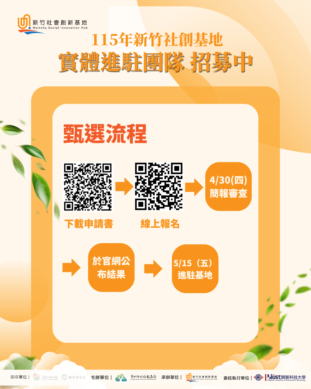 新竹縣政府長期致力於推動青年創新創業,114年於本縣同心樓(身心障礙綜合福利服務中心)3樓成立「新竹社會創新基地Hsinchu Social Innovation Hub」(以下稱本基地),本基地以社會企業及社會創新為發展核心,提供青年創業團隊所需之專業空間、設備資源及經營輔導,期許青年經由本基地營運單位的培植輔導下參與各項社會議題,並以創新方式增進解決社會問題的能力,進一步創造新竹縣永續創業的動能,深化在地經濟與社會影響力。 旨揭招募相關資訊如下: 申請方式統一採線上報名方式辦理,申請網址:https://www.surveycake.com/s/7zP1A。 受理申請收件時間:即日起至115年4月23日(星期四)23時59分止。 簡報審查:115年4月30日(星期四),採視訊會議進行。 公布審查結果及進駐:115年5月5日(星期二)公布審查結果並於5月15日(星期五)開始進駐。 詳情可至新創竹夢資源網( https://hys.hsinchu.gov.tw )或新竹縣政府教育局青年事務科粉絲專頁查詢。