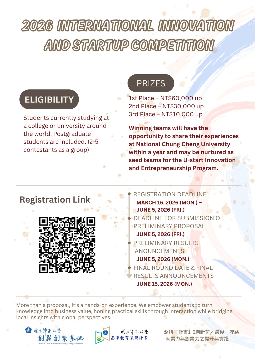 說明: 一、「2026國際創新創業競賽(學生組)」旨在推動全國及海外大專院校學生對創業的渴求與創新趨勢的興趣,本年特設「一般組」及「國際組」(英文提案)之競賽,並開放國內、外學生共同參與競賽,提高競爭力及多文化交流。 二、競賽對象:全國及海外大專院校學生(含研究生);2至5人一組。 三、競賽期程:報名開放自115年3月16日至115年6月5日、參賽資料繳交截止日為115年6月5日、複賽日暨Demo Day為115年6月15日。 四、獎勵方法(各組):第一名:6萬元及獎狀每人1紙、第二名:3萬元及獎狀每人1紙、第三名:1萬元及獎狀每人1紙,優勝隊伍於一年內,保有機會於國立中正大學經驗分享,並加以培育成未來U-start plan創新創業種子隊伍。 五、競賽相關資訊:https://startupland.ccu.edu.tw/p/405-1249-86616,c3078.php?Lang=zh-tw 。