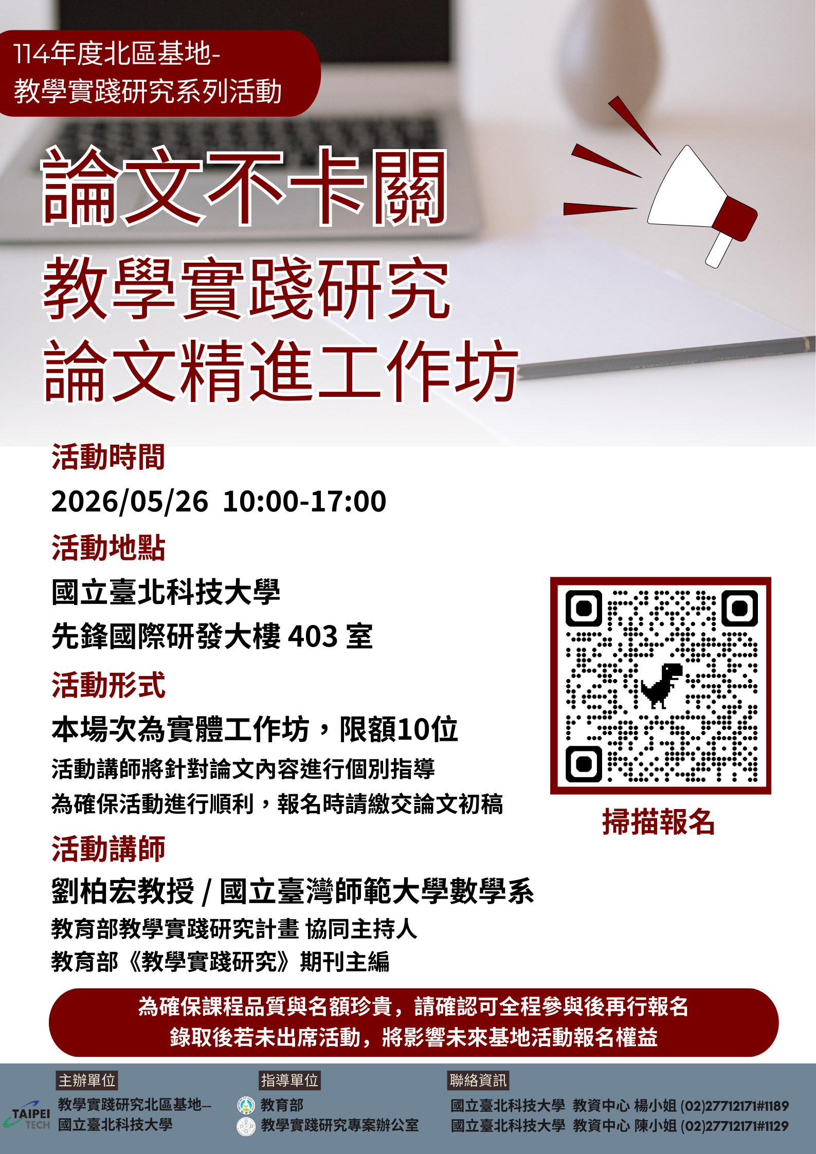 一、本校推動教育部高教深耕計畫及教學實踐研究區域基地計畫,特辦理教師精進工作坊,以提升教學品質及學生學習成效。 二、活動資訊(一) 主題:論文不卡關:教學實踐研究論文精進工作坊 講師:劉柏宏老師│國立臺灣師範大學數學系教授/教育部教學實踐研究計畫 協同主持人/教育部《教學實踐研究》期刊主編 時間︰115年5月26日 (二) 10:00~17:00 辦理方式︰本工作坊為實作工作坊,請全程到場參與。 地點:國立臺北科技大學 先鋒國際研發大樓403室 (臺北市大安區忠孝東路三段46號)。 報名人數上限:正取10人,備取5人。 報名資格說明:本次講師將個別指導論文寫作,為確保活動進行順利,報名時請繳交論文初稿。 研習證書︰活動全程參與者將核發研習證書。 報名網址︰https://forms.gle/EsdeJ8oEyKc6FHLcA,報名至115年5月12日(二),如額滿將提早關閉表單。 三、活動資訊(二) 主題:虛擬實境與科技融入跨域USR教與學的奇妙碰撞 講師:洪菁霞老師│國立成功大學物理治療學系教授/113年度教育部教學實踐研究績優計畫得主 時間︰115年5月12日(二)10:00-12:00 辦理方式︰Google Meet 線上講座 研習證書︰活動全程參與者將核發電子研習證書 參與對象:全國大專校院教師,限額500名。 報名網址:https://forms.gle/SdQaQqc6n1ENyYj49,報名至115年5月7日(四),如額滿將提早關閉表單。 四、活動資訊(三) 主題:數位原生代的任務導向與逆向設計教學實踐 講師:鈕方頤老師│康寧大學企管系副教授 時間︰115年5月26日(二) 10:00~12:00 辦理方式︰Google Meet 線上講座 研習證書︰活動全程參與者將核發電子研習證書 參與對象:全國大專校院教師,限額500名。 報名網址:https://forms.gle/Epoz8DfaTJb1LyBL7,報名至115年5月25日(一)11時止,如額滿將提早關閉表單 五、檢附活動海報,敬請宣傳。 六、聯絡資訊︰國立臺北科技大學教學資源中心陳小姐,電話︰02-27712171#1129,email︰vivian1012@mail.ntut.edu.tw