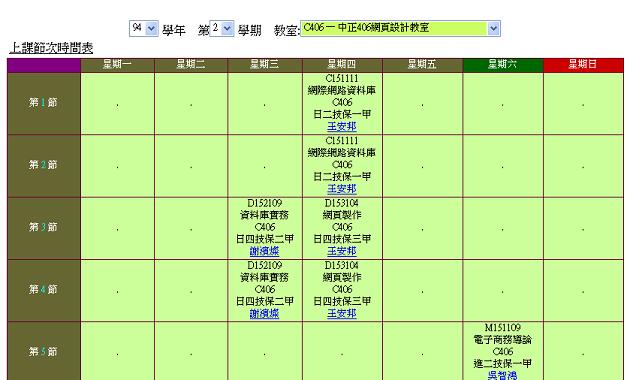 選擇欲查詢之學年、學期與教室,便可顯示該教室之使用課程節次